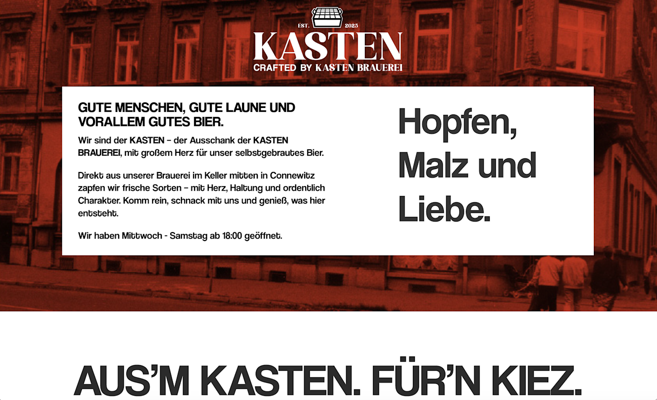Kasten Leipzig ist mehr als eine Bar oder Kneipe – es ist der physische Anlaufpunkt der Kasten Brauerei in Leipzig. Was fehlte, war ein digitaler Auftritt, der diese Rolle klar transportiert: Die Website war nicht mehr zeitgemäß, das Instagram-Profil uneinheitlich und das Gesamtbild nach außen unscharf.